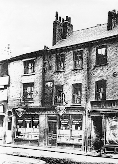 Thomas Dunham Whitaker in his history of Leeds (Loidis and Elmete, Leeds: Robinson, Son & Hernaman, 1816) said the library's original premises "at the sign of the dial" were "in a dark and incommodious garret in a backyard". In the early 19th century, the building that had once housed the library and Ogle's bookshop was combined with the Golden Cock public house (to the left in the picture above but now rebuilt in brick) to make a larger, double-fronted premises. This public house closed in the early 1960s. Today the site is occupied by the Superdrug shop though a golden cock in relief may still be seen above.